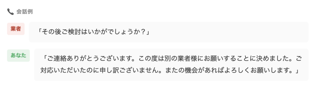 理由を細かく説明する必要はありません。「他社に決めました」の一言に「ありがとうございました」を添えるだけで十分です。長々と説明すると交渉に引き込まれることがあります。