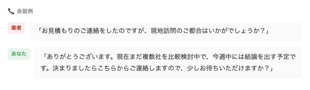 電話に出た瞬間、業者は「今すぐ話を進めよう」というモードになっています。まず「まだ他社も含めて検討中です」と伝えることで、あなたが意思決定の主導権を持っていることを示せます。